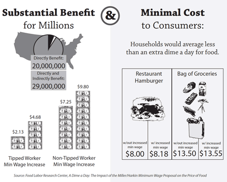 Some people’s instinctual belief that paying $12 each hour to someone to flip burgers will cause prices to rise significantly might be correct. Or it could be just a hunch. But, so what? Unless it’s a substantial change, it’s not economically dangerous. Selling a Big Mac Meal for $5.99 versus $6.29 is hardly a fall off of a cliff for a business regarding profits. And the research that I’ve seen shows that raising the minimum wage to $10 or $15 per hour will effect a smaller rise in consumer prices than that. As one example, the Employment Policies Institute referenced a large academic study that revealed “a 10 percent increase in the minimum wage resulted in a 0.4–0.7 percent increase in restaurant prices. Much of the increase occurred within the first month of the wage hike. In the fast food sector, prices rise 1.5 percent in response to a 10 percent increase.” So, if the current $7.25 per hour was doubled to $14.50, the cost of that same Big Mac Meal would be just $6.14.